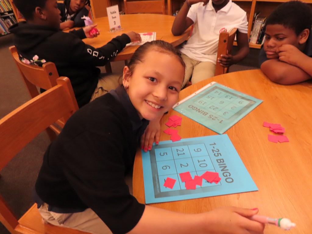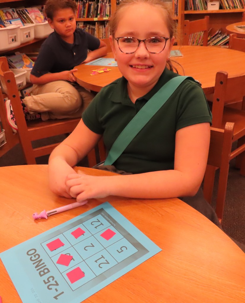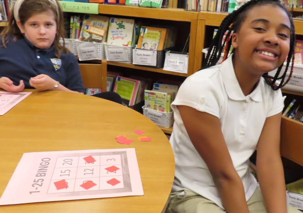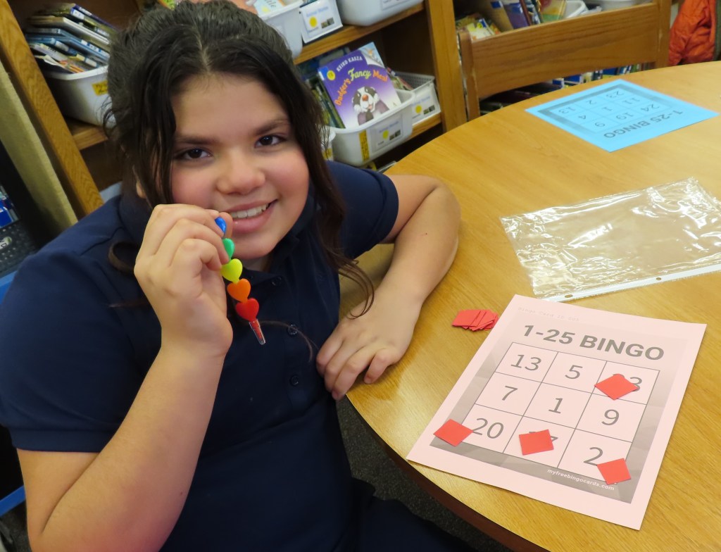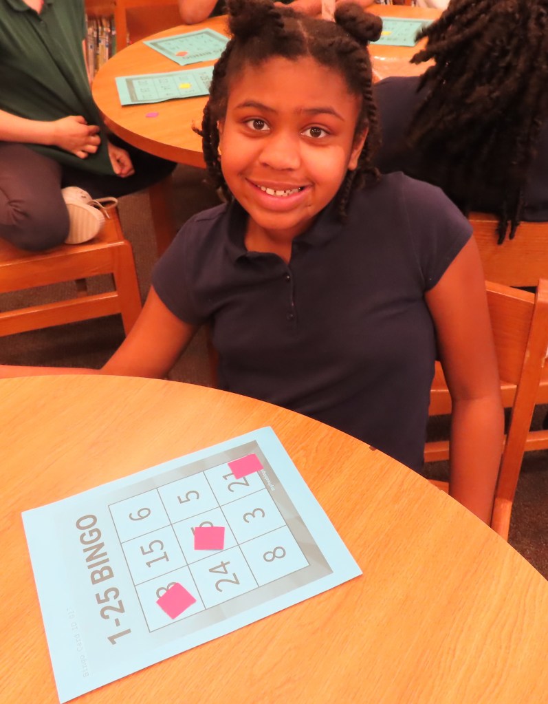 Grades 2 through 5 are playing 3X3 bingo to practice signing the numbers 1-25. A student first rehearses signing the numbers and then “calls” the numbers for the bingo game. There is no talking during the playing of the game. A row of three in either direction counts as a win. This hopefully will be a real world application of signing numbers.