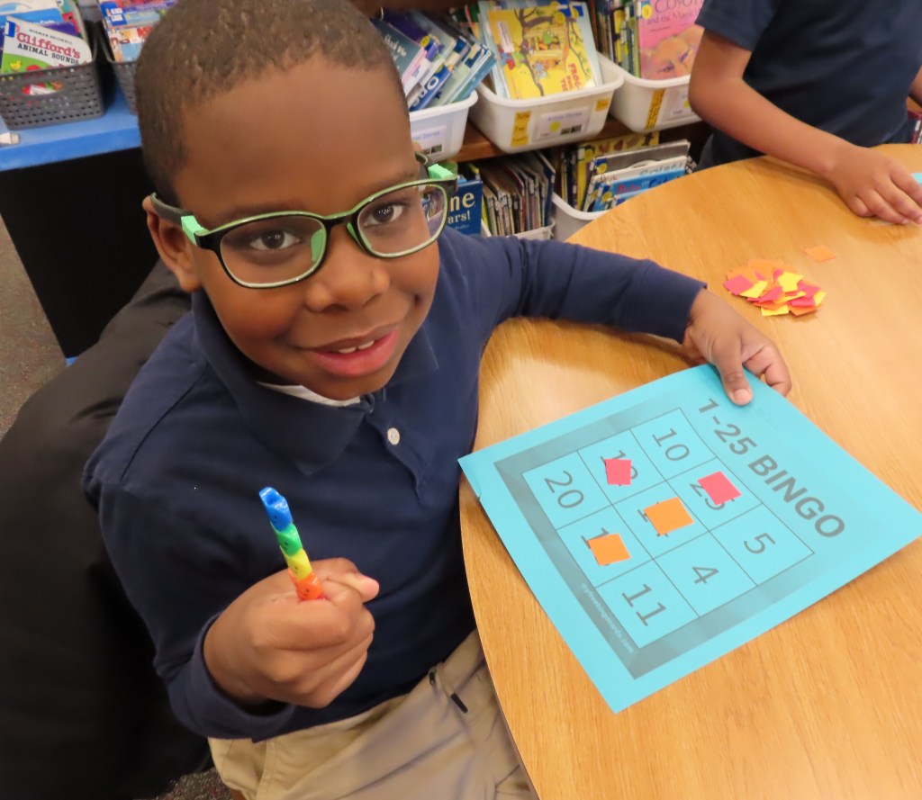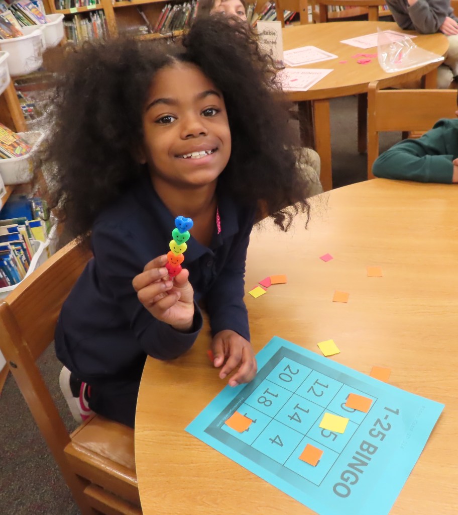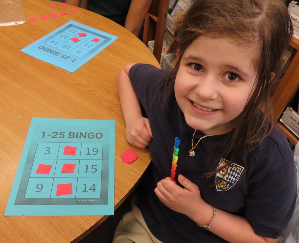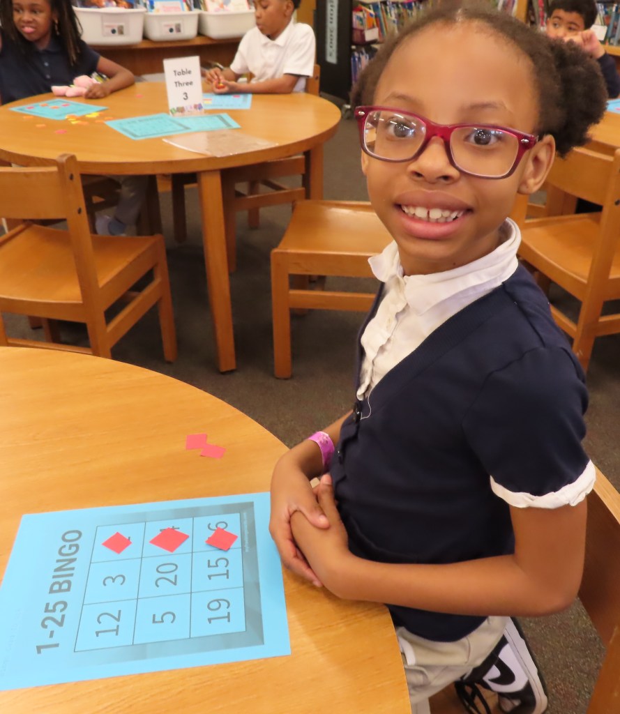 Grades 2 through 5 are playing 3X3 bingo to practice signing the numbers 1-25. A student first rehearses signing the numbers and then “calls” the numbers for the bingo game. There is no talking during the playing of the game. A row of three in either direction counts as a win. This hopefully will be a real world application of signing numbers.
