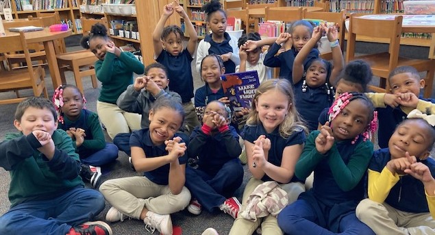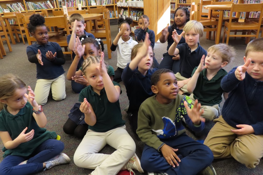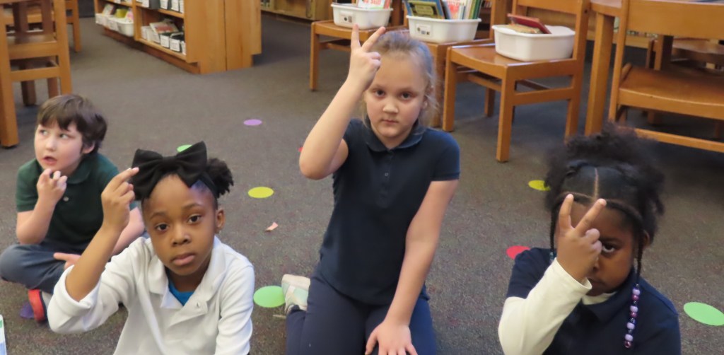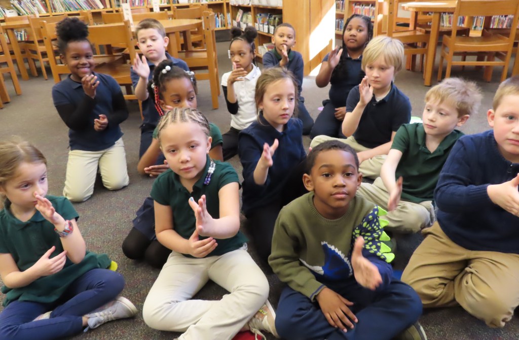 K5 learned the word goat in ASL in connection with reading this fun tale about a goat.First Grade signing motherFirst Grade signing spring.First Grade signing father.K5 signing Friend after reading Make More Smores and the friends of bears and raccoons.