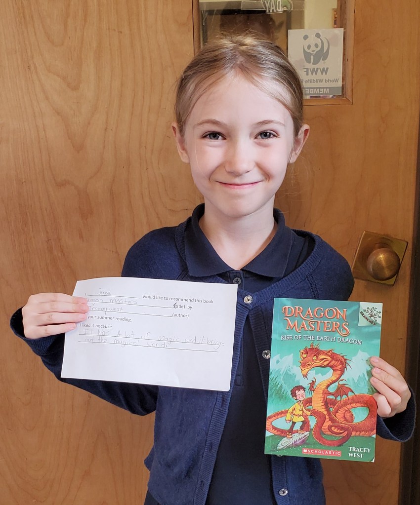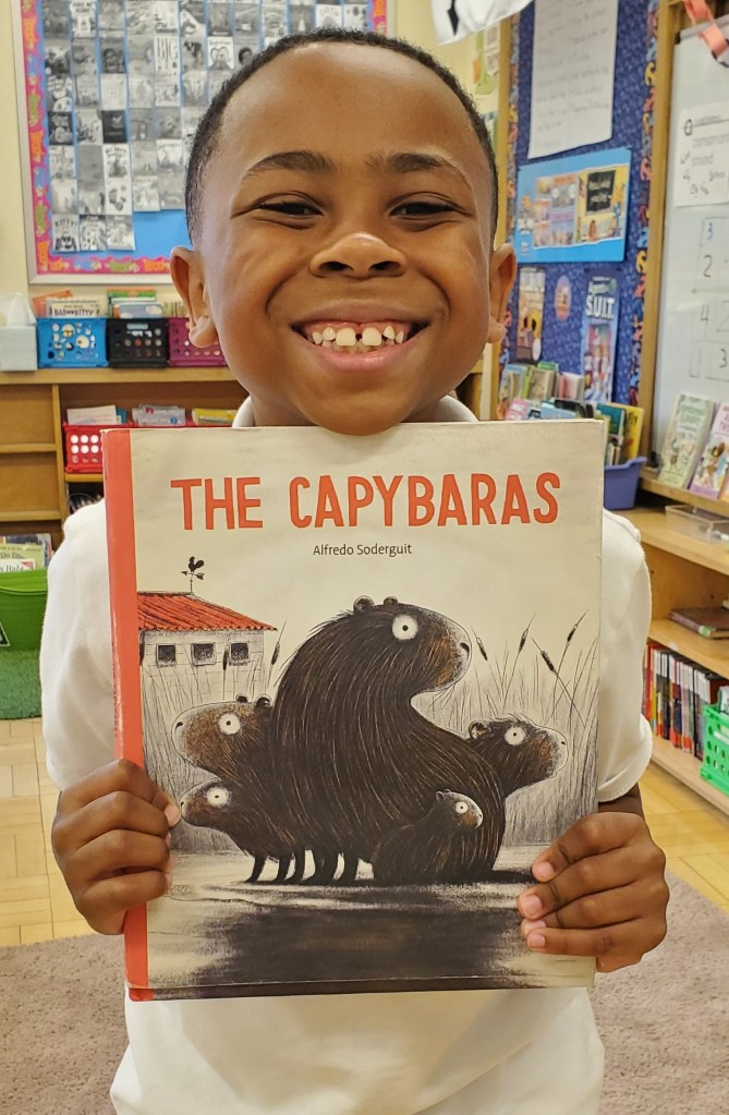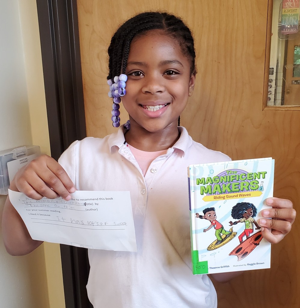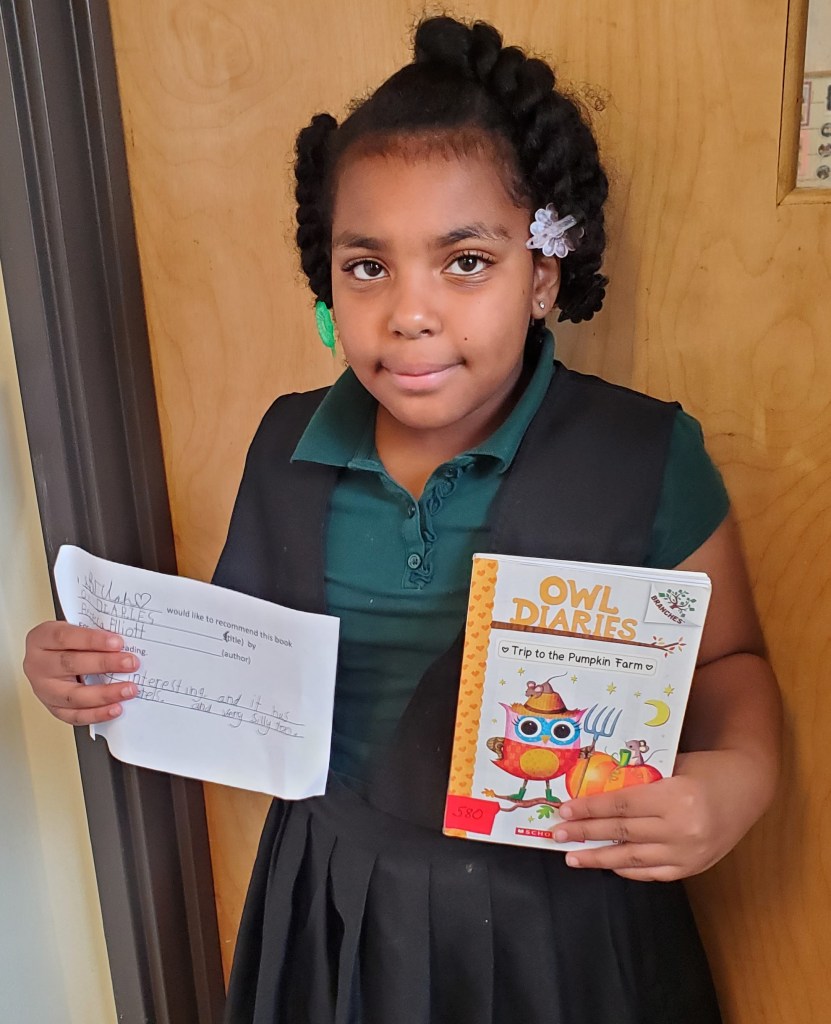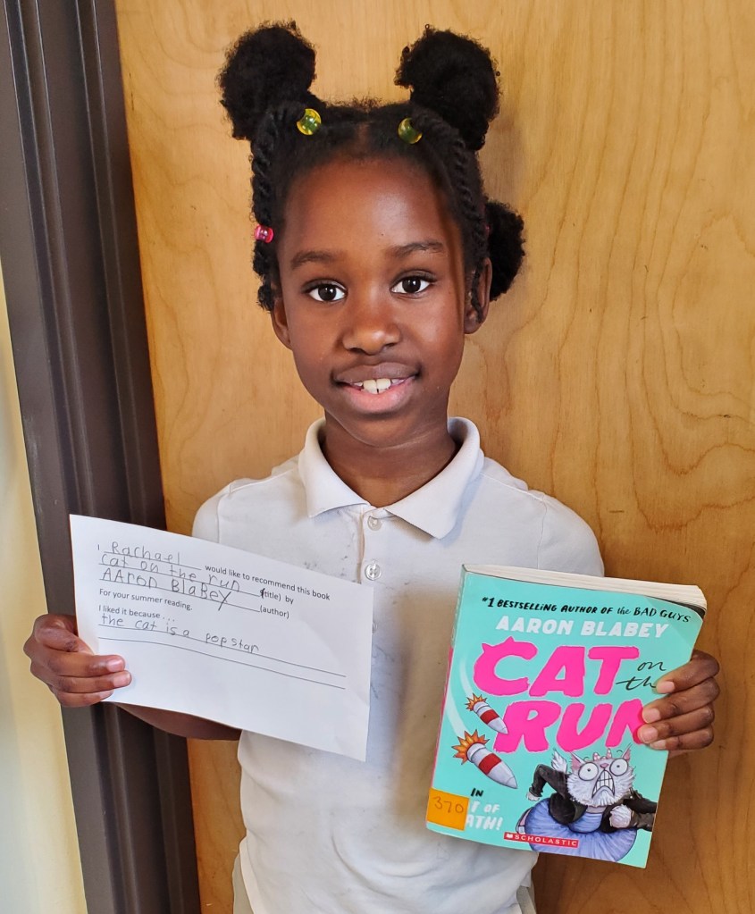 Grayson recommends Harry Potter and the Sorcerer’s Stone. “It is about magic. Harry Potter’s parents died so he went to live with his aunt and uncle.”Lily recommends Summer According to Humphrey. It’s about a Hamster and not being scared of summer.Nevheh recommends I Really Like Slop. “They are funny.”Rachael recommends Cat on the Run. “The cat is a popstar.”A’ Feyah recommends The Magnificent Makers. “It has lots of science.”Killian recommends Hilarious Jokes for 8 year old kids. “The jokes are ‘hillllllllllllarious’ and there are some riddles too.”SaBriah recommends Owl Diaries. “It’s very interesting and it has good details and is very silly too.”Micky recommends Dragon Masters #7. “I liked how the dragon looks.”Aaliyah recommends Pizza and Taco. ” I like that it has pizza and taco. They are foods. I love that food, yum!”June recommends Dragon Masters. “It has a lot of magic and it brings out the magical world.”Jacob recommends The CapyBaras. “It is so cute!”